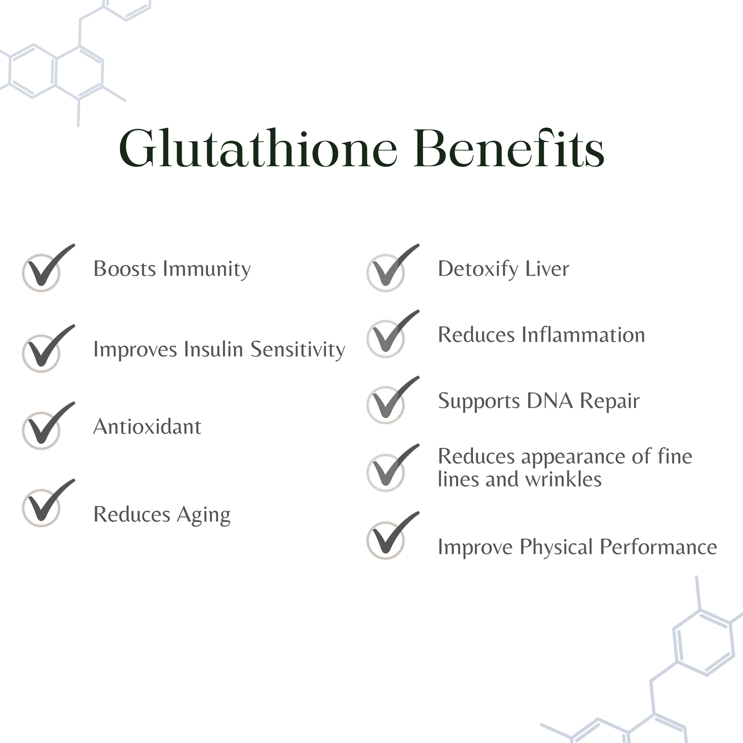 Studies have shown that glutathione can help to reduce the production of melanin, which can lead to a more even skin tone and reduce the appearance of dark spots and hyperpigmentation. Glutathione also helps to boost the immune system, which can have a positive impact on the health of the skin. It prevents or reverses acne, wrinkles and crows feet via detoxification of the skin and body. In addition It eliminates and gets rid of age spots, liver spots, brown spots, lentigines, and dark circles under the eyes.